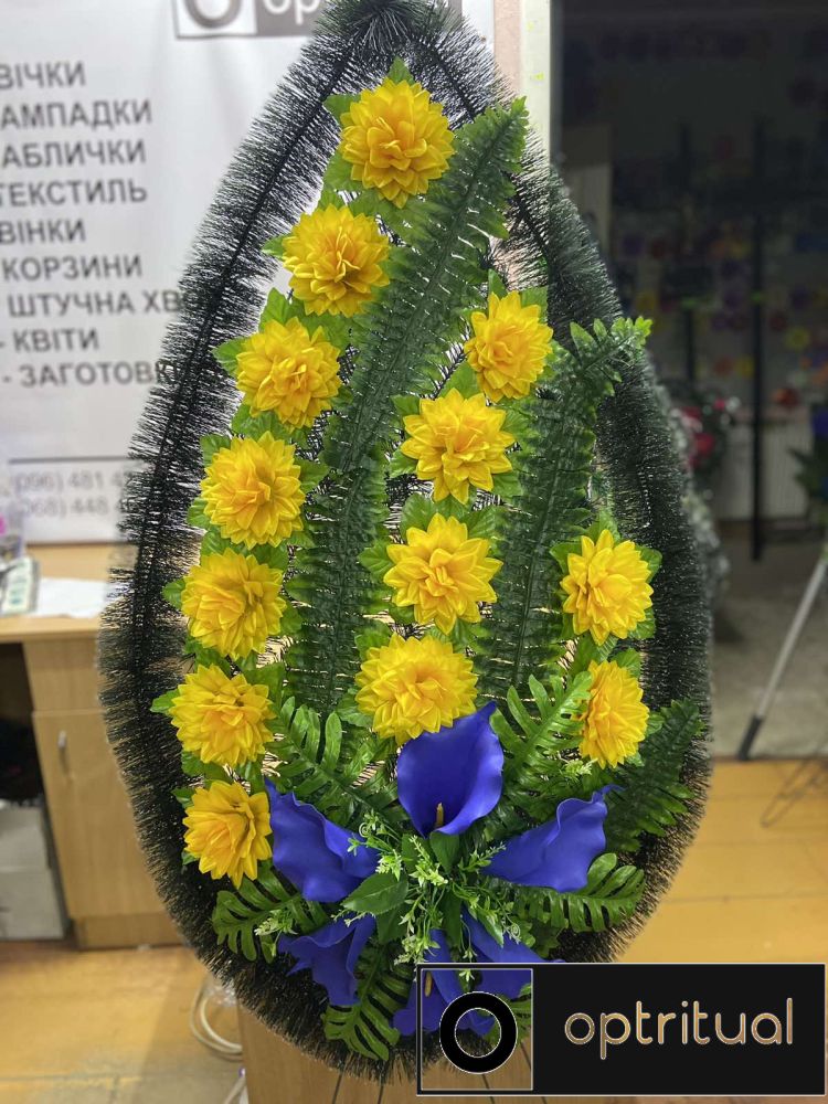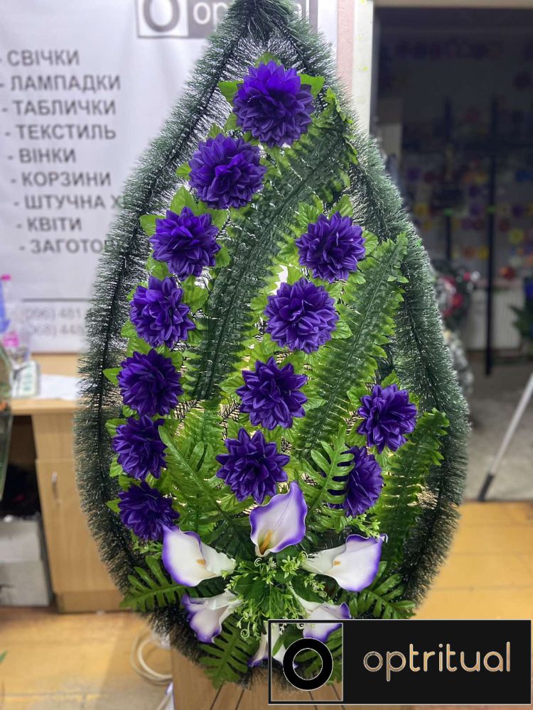 Цей вінок виражає глибоке співчуття та пам’ять про покійного. Він може бути використаний як прикраса на могилі або під час траурних обрядів.